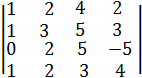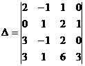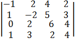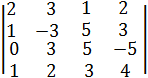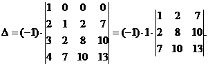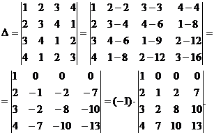 Решение. Будем занулять все, кроме первого, элементы первой строки. С этой целью вычтем из второго, третьего и четвёртого столбцов первый столбец, умноженный соответственно на 2, 3 и 4. Получим