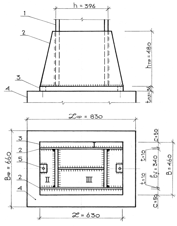 2 – траверса; 3 – плита; 4 – фундамент; 5 – анкерный болт