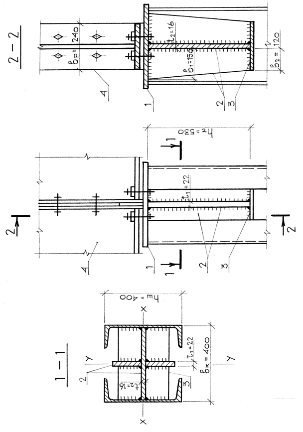 Расчет траверсы. Нагрузка со стержня колонны передается на траверсы через сварные швы, длина которых и определяет высоту траверсы. При четырех швах с высотой катета ![]()