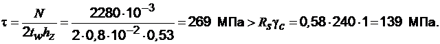 Вывод: проверка стенки колонны толщиной 8 мм на срез не выполняется. Поэтому в пределах высоты оголовка на сварных швах встык устанавливается вставка большей толщины. Требуемая толщина стенки из условия среза: