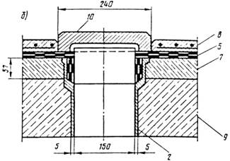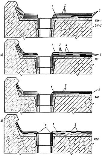 2 - армирующий материал; 3 - битумная мастика; 4 - рулонный изол; 5 - мастика МБР; 6 - тиоколовая мастика; 7 - резиновый закладной элемент; 8 - рулонная резина