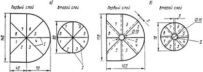 Рис 7. Раскрой армирующего материала на сектора (а) и порядок их укладки (б) при устройстве сопряжения гидроизоляции с водоотводными и строповочными трубками: