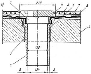 4.74. Выполненную и заведенную в раструб водоотводных и строповочных трубок гидроизоляцию зажимают прижимным стаканом, а отверстия трубок перекрывают сверху предварительно окрашенными битумной грунтовкой решетчатой и сплошной крышками (рис. 8).