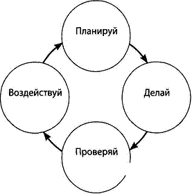 Колесо Деминга представляет собой 4 стадии: Планируй – Делай – Проверяй – Воздействуй.