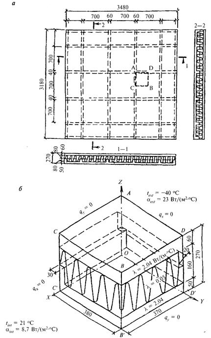 Процесс теплопередачи такой ограждающей конструкции трехмерен, так как распределение температур определяется не только потоками теплоты, перпендикулярными плоскости ограждения, но и потоками теплоты в его плоскости. Поле температур симметрично относительно координатных плоскостей, поэтому для расчета возможно вырезать исследуемую область конструкции плоскостями, параллельными координатным (на рисунке М.2, а помечено буквами ADBС). На рисунке М.2, б представлено аксонометрическое изображение этой части конструкции. Условия теплообмена: на плоскостях AOD¢D, СС¢ОА, BB¢D¢D, CC¢B¢B тепловые потоки, перпендикулярные осям координат ОХ и OY, равны нулю; на плоскостях ACBD и OC¢B¢D¢ возможно задать граничные условия второго рода: