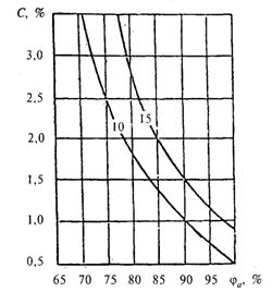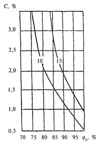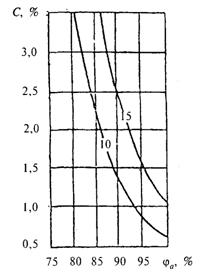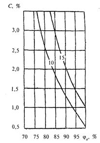 2 - Изолинии сорбционного влагосодержания керамзитобетона r0 = 1200 кг/м3, содержащего хлорид калия, при изменении относительной влажности воздуха ja, %, и массового солесодержания С, %