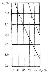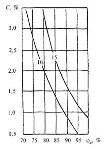 6 - Изолинии сорбционного влагосодержания керамзитобетона r0 = 1200 кг/м3, содержащего NaCl - 30 %, КСl - 60 %, MgCl%, при изменении относительной влажности воздуха ja, %, и массового солесодержания С, %, в стенах цехов сушки