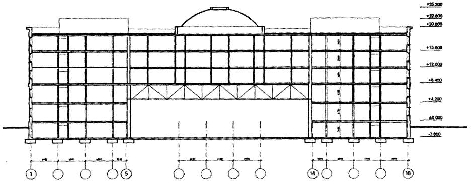 Второй тип стены применен в ограждениях основных лестничных клеток и стенового ограждения купола и выполнен из железобетона толщиной 250 мм, утепленного минераловатными плитами толщиной 135 мм с облицовочным слоем из гранитных плит на относе. Сопротивление теплопередаче этой стены равно