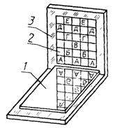1— образец, придвинутый вплотную к вертикальной поверхности приспособления;
