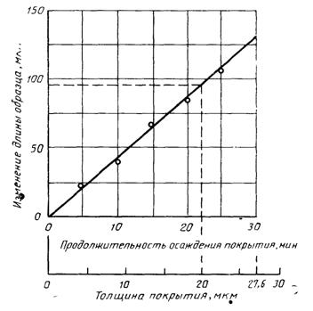 Затем строят график зависимости изменения длины образца от продолжительности осаждения покрытия, дополненный прямолинейной шкалой для толщины покрытия. По графику определяют изменение длины образца для выбранного значения толщины покрытия (см. черт. 4).
