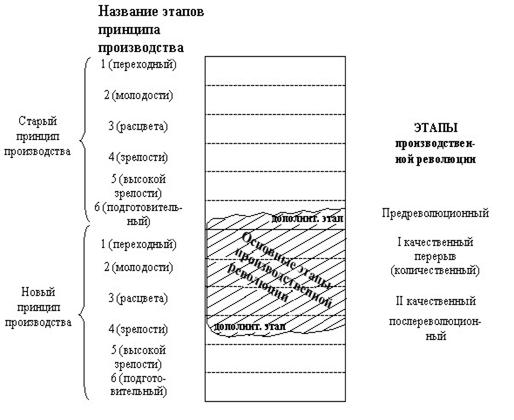 Производственная революция в моем понимании является неотъемлемой частью (первой "половиной") принципа производства. Поэтому весь цикл можно представить в двух этапах (совершение производственной революции - развитие зрелых отношений). Такой подход наглядно демонстрирует основную интригу цикличности крупных периодов исторического процесса. Если в первой их половине наблюдаются прежде всего глубокие качественные производственные изменения, то со второй половины особенно глубокими становятся изменения политических и социальных отношений, общественного сознания, культуры. В эти периоды политико-правовые и социально-культурные отношения, с одной стороны, подтягиваются к вырвавшимся вперед производительным силам, а с другой - сами создают новый уровень, откуда начинается импульс для зарождения нового принципа производства (Схему соотношения принципов производства и производственных революций см. на рис. 1 в Приложении).