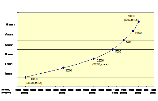 1. | Охотничье-собирательский | 40 000– 30 000 – 28 000 до н. э.) 10 | 30000– 22 000 – 20 000 до н. э.) 8 | 22 000 – 17 000 (20000– 15 000 до н. э.) 5 | 17000 – 14 000 (15000– 12000 до н. э.) 3 | 14 000– 11 500 – 9500 до н. э.) 2,5 | 11 500– 10 000 (9500– 8000 до н. э.) 1,5 | 40 000– 10 000 – 8000 до н. э.) 30 |