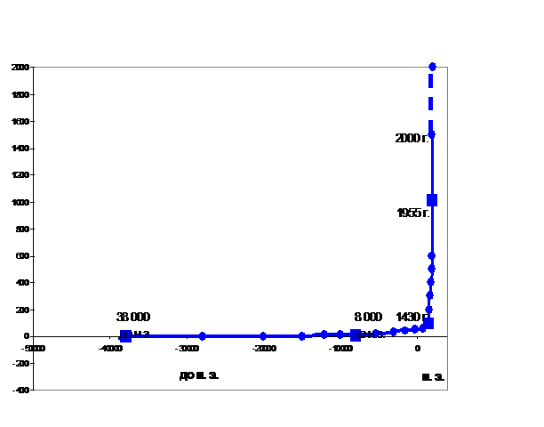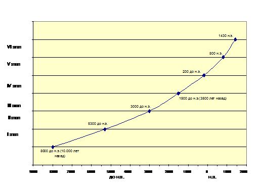 2. | Аграрно-ремесленный | 10 000– 7300 (8000– 5300 до н. э.) 2,7 | 7300– 5000 (5300– 3000 до н. э.) 2,3 | 5000– 3500 (3000– 1500 до н. э.) 1,5 | 3500– 2200 (1500– 200 до н. э.) 1,3 | 2200– 1200 (200 до н. э. – 800 н. э.) 1,0 | 800– 1430 н. э. 0,6 | 10 000–570 (8000 до н. э.–1430 н. э.) 9,4 |