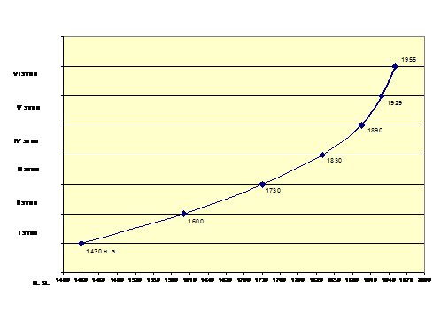 4. | Научно-информационный | 1955– 2000 (1955– 1995)[2] 0,04–0,045 | 2000– 2040 (1995– 2030) 0,035–0,04 | 2040– 2070 (2030– 2055) 0,025– 0,03 | 2070– 2090 (2055– 2070) 0,015– 0,02 | 2090– 2–2080) 0,01–0,015 | 2105– 2115 (2080– 2090) 0,01 | 1955– предпо- ложительно 2090/ 2115 0,135–0,160 |