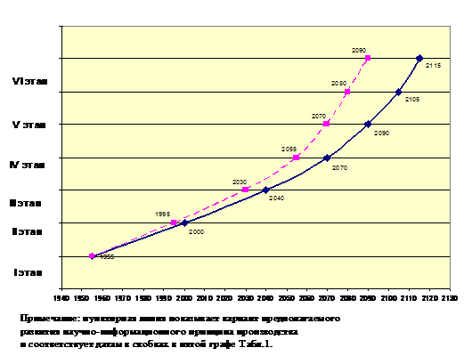 Кончился только один этап научно-информационного принципа производства и начался второй. Поэтому все расчёты длительности будущих этапов носят гипотетический характер (см. Таблицу 1, 2 и Рис. 5).
