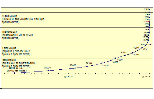 Рассмотрим теперь хронологию принципов производства, производственных революций и их этапов (см. также Таблицы 1 и 2 в Приложении). Начало можно датировать примерно 40-50 тыс. лет назад (для удобства возьмём ближнюю к нам датировку - 40 тыс. лет), то есть с появления первых бесспорных признаков подлинно человеческой культуры и общества. Хотя этот момент не совпадает с современными датировками появления Homo sapiens (100-200 тыс. лет назад), однако только с упомянутого периода 40-50 тыс. лет назад можно уверенно говорить о человеке современного культурного типа, в частности, о появлении языка, а также "действительно человеческой" культуры. Предположение, что речь появилась существенно раньше, остаётся пока на уровне гипотез и оспаривается некоторыми учёными, тогда как "все согласны, что 40000 лет назад речь существовала везде" (Холден). Именно с этого времени ведущими движущими силами развития людей становятся социальные силы, и можно говорить о социальной эволюции в настоящем смысле.