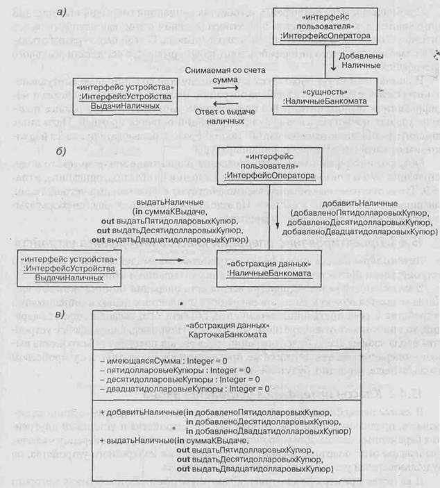 9.3.1. Пример класса абстрагирования данных. Для знакомства с классами абстрагирования данных рассмотрим диаграмму кооперации из аналитической модели (рис.9.2а), состоящую из двух объектов, которым нужен доступ к объекту Наличные Банкомата. Атрибуты данного объекта приведены в статической модели: это количество пяти-, десяти - и двадцатидолларовых купюр в устройстве выдачи наличных. Таким образом, в объекте должны быть внутренние переменные, содержащие соответствующие счетчики купюр. Таким образом, мы проектируем класс Наличные Банкомата с четырьмя атрибутами: имеющаясяСумма, пятидолларовыеКупюры, десятидол-ларовые Купюры, двадцатидолларовыеКупюры. Начальное значение всех атрибутов установлено в ноль.