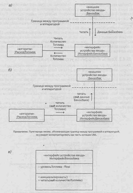 В качестве примера рассмотрим объект Интерфейс Бензобака, у которого есть операции инициализировать и читать. Аналитическая модель (рис.9.3а) показывает, что этот объект получает запрос Читать Количество Топлива от объекта Расход Топлива. Затем объект Интерфейс Бензобака просит объект Бензобак сообщить, сколько бензина осталось. В проектной модели (рис.9.36) вызывается операция читать внешнего объекта Бензобак, которая возвращает ответ данныеБензобака. Как это происходит на самом деле, зависит от реализации физического интерфейса. Так или иначе, объект Интерфейс Бензобака возвращает вызывающему объекту количествоТоплива.