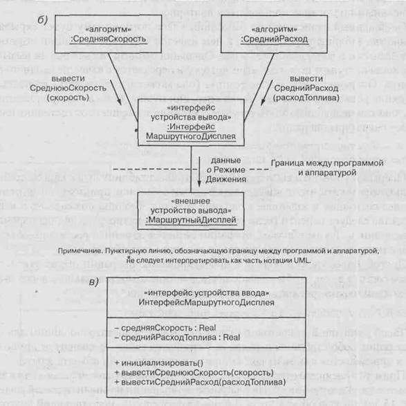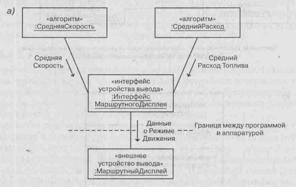 Рассмотрим диаграмму кооперации из аналитической модели на рис.9.4а. Объект Интерфейс Маршрутного Дисплея, помеченный стереотипом «интерфейс устройства вывода», получает сообщения Средняя Скорость и Средний Расход и выводит их на Маршрутный Дисплей.