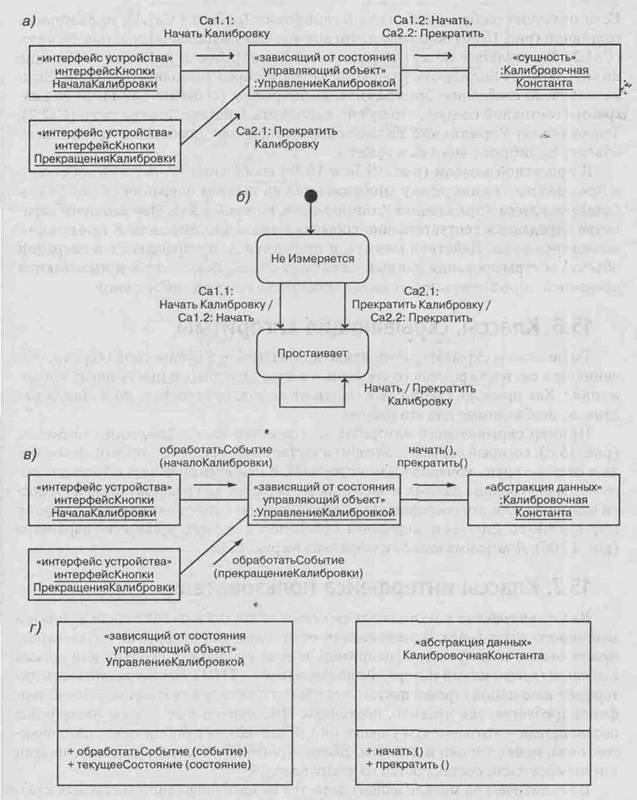 В проектной модели (рис.9.5в и 9.5г) сообщения Начать Калибровку и Прекратить Калибровку отображаются на вызовы операции обработать Событие класса Управление Калибровкой, которой в качестве входного параметра передаются соответственно события началоКалибровки и прекраще-ниеКалибровки. Действия начать и прекратить превращаются в операции объекта абстрагирования данных Калибровочная Константа и вызываются операцией обработатьСобытие объекта Управление Калибровкой.