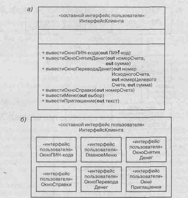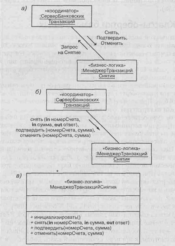 Рассмотрим, к примеру, класс Карточка Банкомата, который инкапсулирует информацию, прочитанную с карточки. Из диаграммы кооперации в составе аналитической модели (рис.9.la) видно, что объект Интерфейс Устройства Считывания Карточек посылает сообщение Данные от Устройства Считывания сущностному объекту Карточка Банкомата. Позже объект Интерфейс Клиента отправляет сообщение Запрос Карточки объекту Карточка Банкомата, который возвращает Данные Карточки. На этапе проектирования определяется точный интерфейс класса. Простое сообщение Данные от Устройства Считывания из проектной модели (рис.9.1б) отображается на вызов операции писать(данныеКарточки, предоставляемой объектом Карточка Банкомата. Сообщение Запрос Карточки отображается на вызов операции читать объекта Карточка. Простому сообщению Данные Карточки соответствует выходной параметр операции читать. Вызовы операций изображаются с помощью нотации UML для синхронных сообщений. На рис.9.1в показан класс абстрагирования данных Карточка Банкомата. Представлены как атрибуты, так и операции. У операции писать имеется один входной параметр – данные Карточки. У операции читать есть один выходной параметр – прочитанные данныеКарточки.