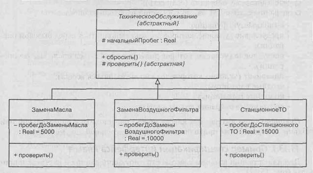 Любой подкласс, допустим Замена Масла, наследует структуру класса Техническое Обслуживание, в том числе определение атрибута начальныйПробег и полное определение (спецификацию и реализацию) операции сбросить, а также спецификацию абстрактной операции проверить. Но реализацию последней операции подкласс Замена Масла должен предоставить сам. Для нее требуется указать расстояние, после которого масло надо менять (скажем, каждые 5 000км), и сообщение, выводимое, когда пробег с момента последней замены превысил заданный порог. Нужно также задать операцию вывестиСообщениеО ЗаменеМасла, которая вызывается для объекта Интерфейс Индикатора ТО. Помимо этого, операция проверить вызывает операцию читать объекта Путь для получения текущего полного Пробега. Она вычитает из него значение начального Пробега, чтобы выяснить, не прошла ли машина 5 000 км и не пора ли, следовательно, менять масло.