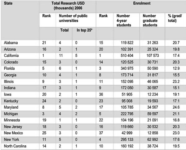 В таблице, в частности, показано, что Аризона с 2мя государственными вузами (один из них в топ-25 вузов страны) занимает 16 место по уровню коммерциализации своих разработок и лишь 20е по числу обучающихся.