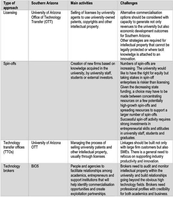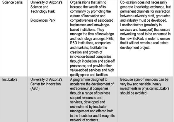 В регионе хорошо налажен взаимообмен между учреждениями высшего образования и бизнесом, причем механизмов такого обмена знаниями много. Некоторые их них представлены в таблице 2, а именно: продажа лицензий, создание новых фирм (спин-офф), создание бизнес-инкубаторов, техно-парков и центров трансфера технологий, консалтинг.