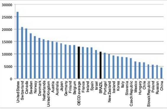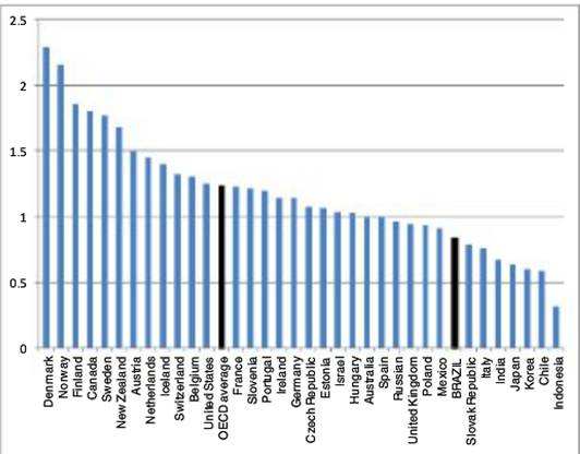 По показателям развития сферы высшего образования Бразилия зачастую отстает от среднего уровня стран ОЭСР. И если по показателю «ежегодные затраты вузов на одного обучающегося» отставание невелико (рисунок 2), то по показателю «доля затрат на высшее образование в % к ВВП» (рисунок 3) разрыв довольно значительный.