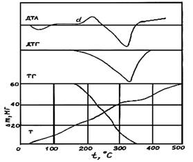 Рис. 3. Дериватограммы АПП (образец №4), термоокислительная деструкция; скорость нагрева 5 град/мин, среда – воздух.