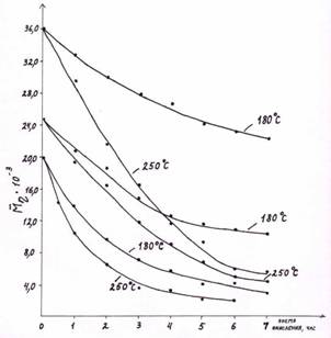 Полученные кинетические параметры хорошо согласуются с литературными данными. Снижение температурного интервала, характеризующего окисление полимера по С-Н связям, значения энергии активации, теплового эффекта реакции термоокислительной деструкции расплава АПП, вероятно связано с особенностями его строения. Кинетика изменения средневязкостной молекулярной массы АПП в зависимости от времени термоокислительной деструкции (расход воздуха - 0,5 мл/мин·г) изображена на рисунке 4. Расплавы полимеров сильно различаются по величине динамической вязкости (рис. 5.), что позволяет определить температурный режим приготовления модифицированных ими композиций.