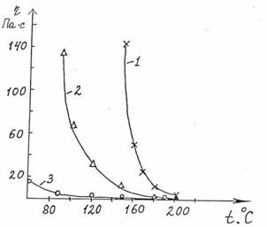 Рис. 4 Кинетика изменения средневязкостной молекулярной массы АПП в зависимости от времени ТОД (расход воздуха – 0,5 мл/мин г) | Рис. 5 Зависимость динамической вязкости полимеров от температуры (1 – АПП, 2 – низкоокисленный АПП, 3 – высокоокисленный АПП |