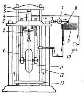 Его плунжер 5 через подвижную траверсу 6 и тяги 12 перемещает стол 13, воздействующий на шину 11, которая подвешена с помощью тяг 1 к траверсе 3.На этой траверсе укреплен крюк 2 подъемной тали для установки колеса. Давление в гидроцилиндре создается насосом 10 и измеряется силоизмерительным прибором 7, показания которого пропорциональны действующей нагрузке.