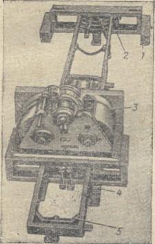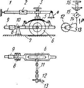 По верхней штанге 1 установки перемещается груз 2. Это позволяет регулировать вертикальное усилие, прикладываемое к испытуемому колесу 6, путем изменения момента груза 2 относительно опоры 8. Винт 3 служит для поддержания рычага в горизонтальном положении и непосредственно передает усилие через рессору 5 на балку 10, закрепленную на оси стойки 8 и имеющую груз 9, служащий для вывешивания колеса относительно опорной плиты 7.Карданный вал 11 соединяет колесо с храповым устройством 12, собачка 14 которого через сектор 13 и трос связана с винтом 16.