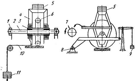 Груз 11 через блок и трос 10 создает боковое усилие на колесе. Ось 2 жестко связана со станиной 1, последняя может качаться на шарнире 8, что необходимо для первоначального вывешивания колеса, которое осуществляется с помощью противовеса 9. Боковая деформация шины фиксируется самопишущим устройством 7. По величине отношения боковой силы к боковой деформации шины определяют ее боковую жесткость.