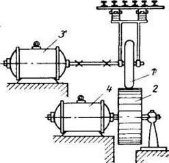 Колесо с испытуемой шиной 1 опирается на беговой барабан 2 и имеет привод от электродвигателя 3, а барабан соединен с генератором 4. Разность мощностей электродвигателя и генератора (за вычетом мощности, обусловленной вентиляционными потерями при вращении шины) определит мощность, затрачиваемую на преодоление сопротивления качению колеса, а коэффициент сопротивления качению колеса 1 может быть вычислен по формуле
