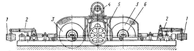 Беговой барабан 5 получает привод от электродвигателя 4 и приводит во вращение две испытуемые шины 3. Они установлены на каретках 6, которые, перемещаясь на роликах по направляющим станины, прижимают шины к беговому барабану под действием грузов 1 через угловые рычаги 2. Станок является универсальным, на нем можно проводить испытания шин диаметром до 1400 мм при нагрузке до 45 кН и скорости качения 25-150 км/ч. Для проверки прочности каркаса при воздействии динамических нагрузок на рабочей поверхности барабана укрепляют различных размеров препятствия.