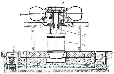 Основными элементами инерционных стендов являются двухвальные вибраторы, закрепляемые на раме и создающие усилие либо момент, которые изменяются по синусоидальному закону. В этом случае рама 5, установленная на пружинных или резиновых опорах 4, представляет собой упругое звено колебательной системы, а вибраторы 3, связанные с рамой, в совокупности со специальными грузами 1, закрепленными на ярме 2, или без них выполняют роль инерционных элементов.