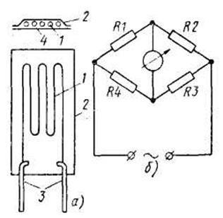 Тензорезистор наклеивают на поверхность детали. При деформации детали будут меняться длина и поперечное сечение нити тензорезистора, что вызывает изменение его сопротивления, а следовательно, и величины протекающего тока. Таким образом, по изменению силы тока в цепи можно судить о величине действующих деформаций в детали, если провести предварительную тарировку. Для увеличения чувствительности тензорезисторы соединяют по мостовой схеме (рисунок 95, б). При этом с помощью одного из резисторов измеряют деформации, например резистором R1; функции резисторов R2 и R3 выполняют резисторы питающего прибора или усилителя. Резистор R4 наклеивают на деталь, которая не деформируется, однако находится с исследуемой в одинаковом температурном состоянии, чем исключается влияние температуры на результаты тензометрирования.
