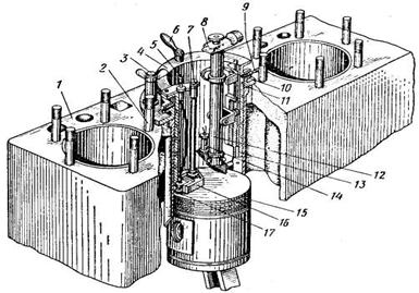 6 - рукоятка шаблона; 7 - рукоятка управления резцедержавкой; 8 - окулярный микрометр; 10 - винт фокусировки микроскопа; 11 - корпус прибора; 12 - микроскоп; 13 - гильза цилиндра; 14 - лампа; 15 - поршень двигателя; 16 - механизм для вырезания лунок;17 - резцедержавка