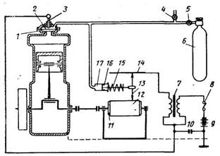 В стенку камеры сгорания индикатора ввернут датчик, камера 1 которого разделена мембраной 2 на две части. Верхняя часть камеры сообщается с баллоном 6 сжатого воздуха, а нижняя часть - с цилиндром двигателя. С баллоном 6 соединен также цилиндр 17. Под воздействием сжатого воздуха и пружины 15 перемещается поршень 16 цилиндра, передвигающий штифт 13 вдоль барабана 11. Барабан приводится во вращение от коленчатого вала двигателя. Давление над мембраной и в цилиндре 17 регулируют кранами 4 и 5. Когда давление в полости над мембраной несколько ниже, чем в цилиндре, мембрана 2 соприкасается с электродом 3. В этом случае замыкается электрическая цепь: аккумуляторная батарея 9 - выключаобмотка низкого напряжения катушки 7-электрод 3 - мембрана 2 - масса (корпус). Параллельно электроду 3 включен конденсатор 10. Вторичная обмотка индукционной катушки одним концом соединена с первичной обмоткой, а другим - со стержнем 14, вдоль которого, соприкасаясь с ним, перемещается штифт 13. В тот момент, когда давление в цилиндре двигателя и под мембраной 2 станет равным давлению воздуха над мембраной, она прогибается, и ее контакт с электродом 3 нарушается. При этом во вторичной обмотке катушки индуктируется высокое напряжение, в результате чего между штифтом 13 и барабаном проскакивает искра, а в навернутой на барабан бумаге 12 пробивается отверстие.