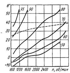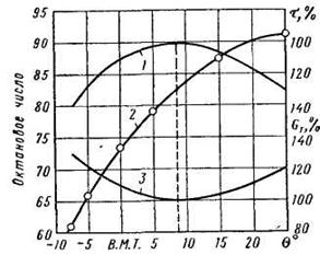 Наиболее высокие требования к октановому числу топлива предъявляются при работе двигателя с малой частотой вращения коленчатого вала. Если применить топливо, антидетонационные качества которого обеспечивают оптимальный угол Ө при малых n, то качества этого топлива при средней и большой частоте вращения будут не использованы, что экономически нецелесообразно, так как высокооктановое топливо является более дорогостоящим, чем низкооктановое. Поэтому обычно для двигателя выбирают топливо с таким октановым числом, которое обеспечивает бездетонационную работу двигателя при средних и больших n. При малых nрегулятор опережения зажигания уменьшает угол 0 по сравнению с оптимальным его значением, и на этих режимах наблюдаются некоторые потери мощности.