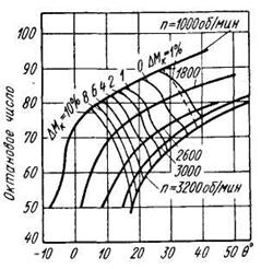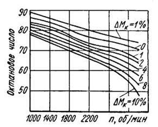 Появление детонации и ее интенсивность зависят от сорта применяемого топлива, конструкции двигателя и эксплуатационных условий. Для того чтобы установить, какое топливо требуется для данного двигателя и в каких пределах, должен быть отрегулирован угол опережения зажигания для работы без детонации, определяют детонационные характеристики. Детонационной характеристикой называется зависимость, определяющая наименьшее октановое число топлива, при котором двигатель работает без детонации, при полном открытии дроссельной заслонки и различной частоте вращения коленчатого вала.