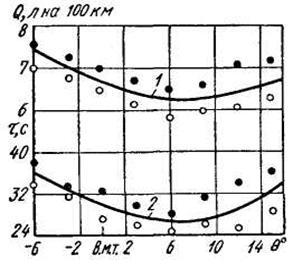 По результатам испытаний при разгоне автомобиля строят экономическую и динамическую характеристики его по углу опережения зажигания при разгоне (рис. 23). Кривая 1 показывает изменение расхода топлива в л на 100 км пути при разгоне автомобиля и различных углах опережения зажигания, а кривая 2 - изменение времени разгона автомобиля при этих же углах опережения зажигания.