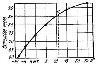 При проведении описанных выше испытаний не на эталонном топливе, а на товарном определяют детонационную стойкость этого топлива в дорожных условиях. Точку α, соответствующую углу опережения зажигания, при котором начинается детонация, наносят на первичную детонационную характеристику автомобиля. Эта точка (на рисунке 24) определяет дорожное октановое число испытуемого товарного топлива.