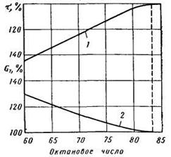 По кривым (рисунок 25) строят итоговую детонационную характеристику автомобиля (рисунок 26), для чего определяют соответствующие октановому числу каждой смеси эталонных топлив относительные изменения расхода топлива (кривая 2) и времени разгона (кривая 1). Характеристику строят только на участке от низких октановых чисел до оптимального.
