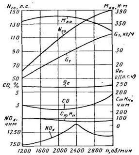 снимают характеристики двигателя (скоростную, нагрузочную, регулировочную и др.), при этом устанавливают содержание вредных веществ в отработавших газах. Графики, на которых наряду с кривой изменения крутящего момента, расхода топлива, угла опережения зажигания нанесены кривые, характеризующие изменение содержания в отработавших газах, вредных и других веществ, называются скоростной токсической характеристикой (рисунок 27), нагрузочной токсической характеристикой и т. п.
