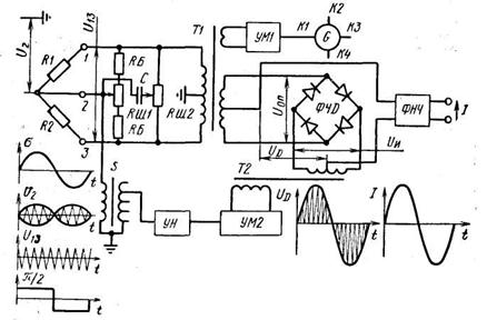 Во входные цепи через клемму 2 подается напряжение разбаланса моста U2 с частотой огибающей этого напряжения вдвое больше частоты измеряемого сигнала σс и с частотой заполнения, равной несущей частоте генератора. Фаза ср между напряжением питания тензорезисторов и напряжением U2 зависит от знака сигнала σс. После входных цепей сигнал поступает на усилитель напряжения УН и усилитель мощности УМ2. Затем усиленное трансформатором Т2 напряжение Uи сигнала подводится к фазочувствительному детектору ФЧД. Таким образом, к этому детектору подводятся два напряжения: по одной диагонали опорное Uoп, по другой - напряжение измеряемой величины Uи.