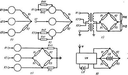 а - мостовая; б - полумостовая; в - полумостовая с дополнительными щетками; г - трансформаторного; д - с радиопередатчиком; R1 - R4 - тензорезисторы; RH1 - RH2 - настроечные резисторы