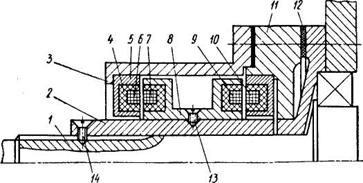Неподвижные сердечники закреплены в крышке 3, которая вместе с корпусом 11 установлена на неподвижную деталь. Подвижные сердечники расположены в блоке 8, который прикреплен к шлицевой втулке 2 винтами 13. Втулка 2 удерживается винтами 14 на валу 1. Зазоры в магнитопроводе регулируют с помощью сменных прокладок 12.